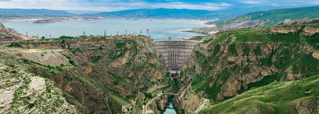 panorama with an arched hydroelectric dam and a reservoir in the mountain valley