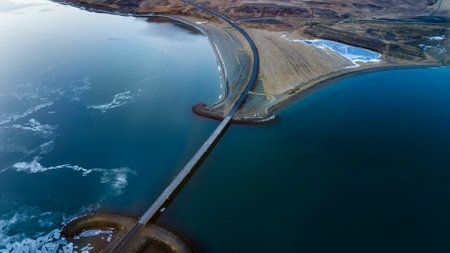 Aerial landscape view of bridge on Kolgrafarfjördur or kolgrafarfjordur viewpoint, Iceland. Taken by drone. Nature, travel, winter background, or wallpaper