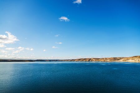 The opposite shore of the azure lake against the blue sky with white clouds. Texture for the background.