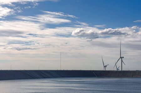 Wind turbines on the dam ridge.Renewable energy clean and good environment.