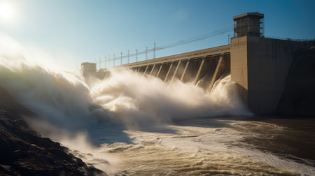 hydroelectric plant, with turbines spinning and water rushing through the dam, created with generative ai
