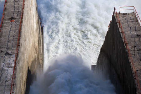 Discharge of excess water from floodgates during flooding. Hydroelectric power station behind a wire fence.