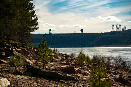 Rocky river bank against the background of the hydroelectric power station. Trees on the rocky river bank. Texture for the background.