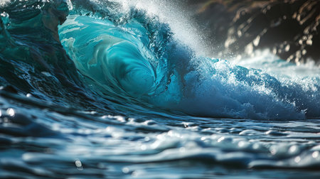 An ocean wave curves and crashes, displaying vibrant blue and turquoise hues. The dynamic composition captures water movement with intricate textures, lit by golden sunlight. This image could serve various purposes, from illustrating environmental themes to use in advertising and design projects.