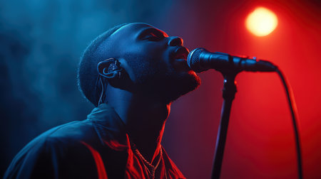 A male performer in the spotlight with a microphone in hand, illuminated by a light show. Ai generated