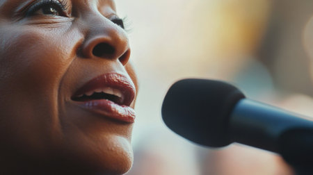A woman is singing into a microphone with smoke coming out of her mouth. Concept of passion and intensity as the woman performs