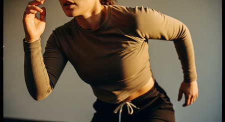 A woman in a brown long-sleeved top with mesh sleeves, posing dynamically with one hand on her head.