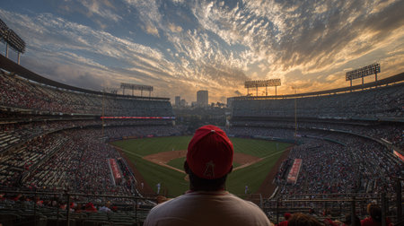 Panoramic view of a baseball stadium filled with spectators during the sunset. The stadium is full of people, and the sky has dramatic clouds. The view encompasses the entire stadium.