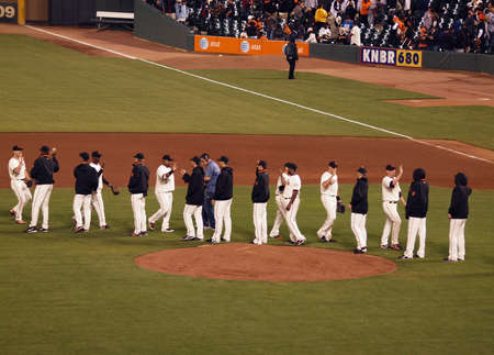 SAN FRANCISCO - JULY 17: Giants Players give each other high fives after game at AT&T Park on October 7, 2010 in San Francisco.