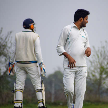 New Delhi India – March 3 2020 : Full length of cricketer playing on field during sunny day in local playground, Cricketer on the field in action, Players playing cricket match at field