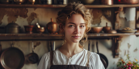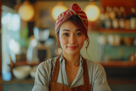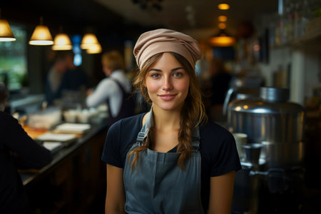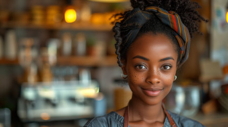 A woman proudly stands in front of a bar, confidently wearing an apron, Waitress in coffee shop, AI Generated