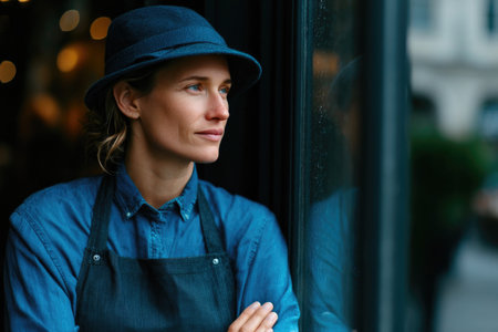Woman in Apron Looking Thoughtfully Out of Cafe Window