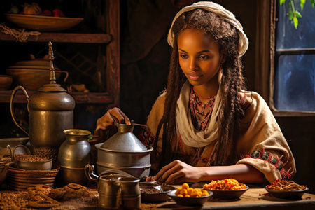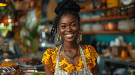 Smiling Woman in Vibrant Attire Preparing Traditional Dishes in a Culturally Rich Kitchen During Mid Afternoon. Generative AI