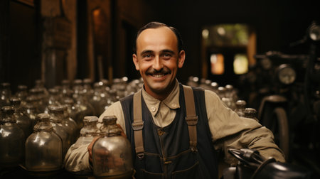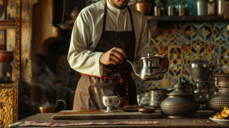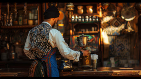 The picture of the tea master or tea brewer that working inside the workshop, the tea master skill that require is tea knowledge, brewing techniques and attention to the detail of the tea leaf. AIG43.