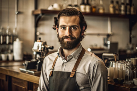 Handsome bearded barista in apron looking at camera while standing in cafe