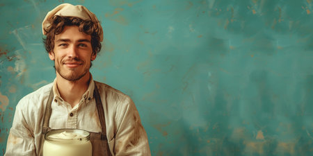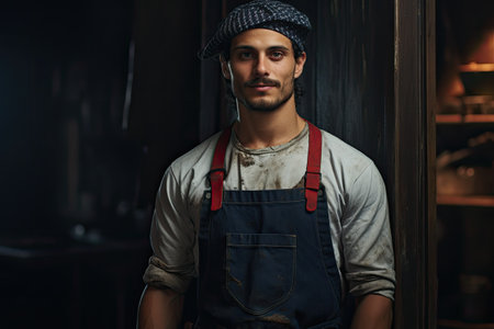 Repair advertisement. Builder or plasterer. mature repairman in uniform. foreman wear boilersuit. Laborer in working clothes. builder in working overalls. Engineer and industrial building. copy space