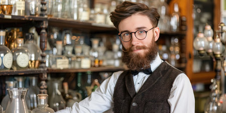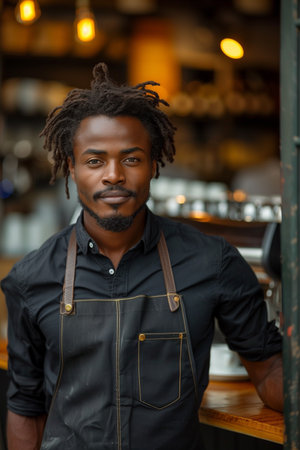 A man in an apron stands behind a wooden counter in a cafe, arms crossed. The interior features a coffee machine, shelves, and various coffee-making accessories. The lighting is bright and inviting, suggesting an environment for commercial or promotional use. The scene implies a focus on service and expertise.