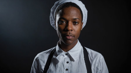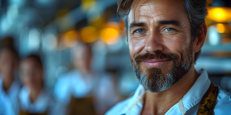 A confident chef stands with arms crossed in an industrial kitchen. His serious expression and traditional attire reflect his professionalism in the culinary arts, creating an inviting atmosphere.