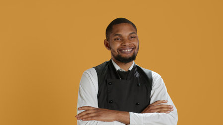 Portrait of restaurant waiter wearing professional uniform and apron getting ready to assist and serve clients. Employee working in service oriented environment for customer satisfaction. Camera A.