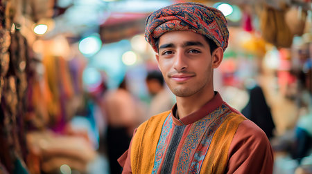 A young Muslim entrepreneur at a co-working space, blending modern business practices with traditional ethical values.