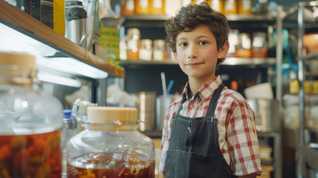 A boy wearing a Future Fermenter apron stands behind the stand ready to answer questions and teach about the fermentation process