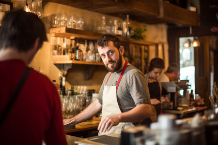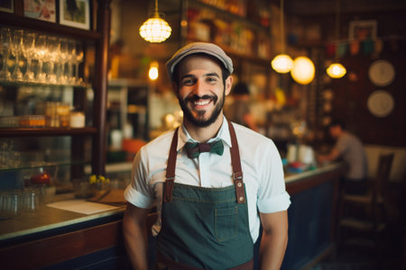 Pub worker with a welcoming smile stands ready to serve in a dimly lit bar.