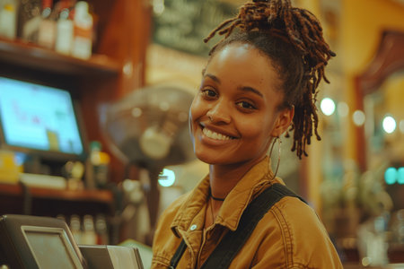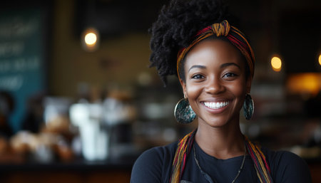 Joyful African Entrepreneur Welcoming Customers at Cafe Counter