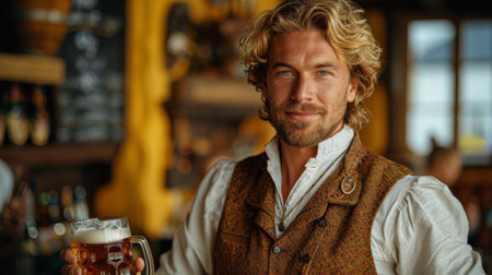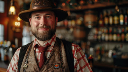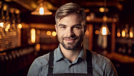 oktoberfest, portrait of a happy handsome German male waiter, plaid shirt, blurred background, evening bar