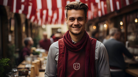 Portrait of handsome young man in red scarf standing in outdoor cafe