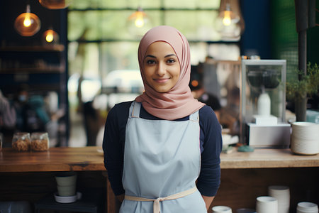 Portrait of a beautiful young muslim woman wearing apron and smiling while standing in cafe