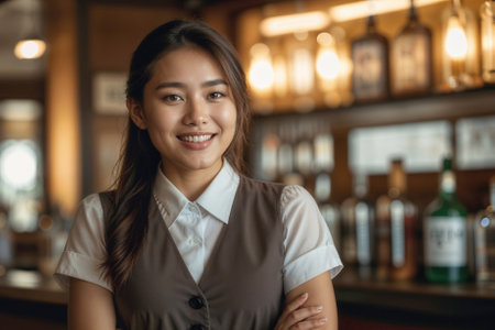 Portrait of happy Asian woman bartender in uniform in hotel bar looking at camera