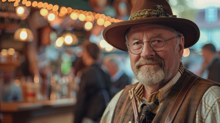 Oktoberfest, portrait of a happy elderly German man in a hat and glasses, plaid shirt, blurred background, street evening bar, copy space, free space for text