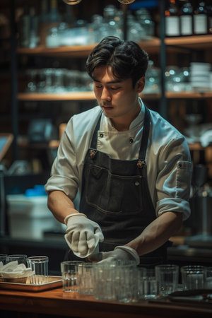 An Asian male employee is cleaning equipment at the bar counter in a cafe.