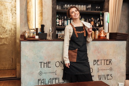 Smiling young waitress small business owner barista bartender in apron looking at the camera standing at the bar restaurant counter.
