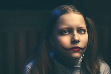 Sad lonely girl crying while sitting in dark room with an attitude of sadness.Concept of depression or domestic violence child