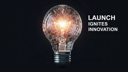 A striking close-up image captures a glowing light bulb, where the glass surface is intricately detailed with a high-tech digital circuit board pattern. The filament inside illuminates brightly, creating a powerful symbol of a new idea or innovation coming to fruition. The dark background enhances the contrast, drawing focus to the light bulb's glow and the digital network design. The text 'LAUNCH IGNITES INNOVATION' accompanies the image, explicitly linking the visual metaphor to the concept of starting new ventures and fostering technological advancement.