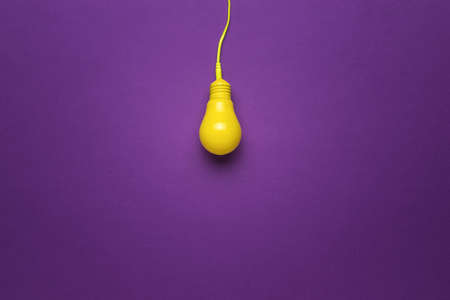 A yellow light bulb on a yellow wire on a purple background. Minimalism. The concept of energy and business. Flat lay.