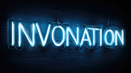A striking blue neon sign features the word Innovation, radiating creativity and modernity. Perfect for showcasing innovative concepts in design and technology.