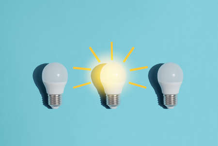 Glowing light LED bulb with copy space, top view. Business, idea, education concept.
