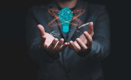 Businessman holding virtual light bulb connection for creative ideas and innovation concept.