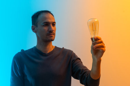 male Hand touching illuminated light bulb, new idea, innovation and inspiration concept, creativity with bulbs that shine glitter.