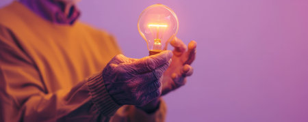 An elderly man holding a dimly lit light bulb, isolated on a soft lavender studio background. The light creates a nostalgic atmosphere.