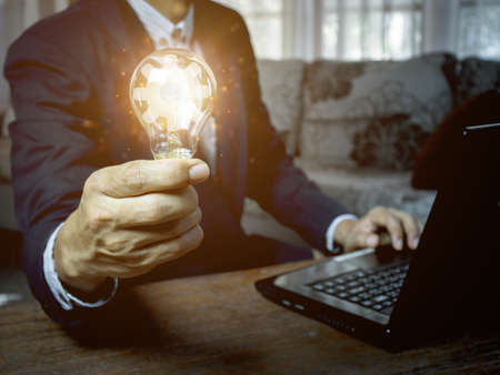 hand of a man with a light bulb And there is a gear icon in it and he is using a notebook computer, ideas inspired by online technology, innovative ideas.