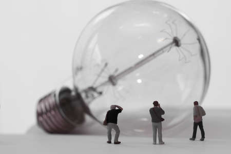A group of miniature individuals generating a creative business idea under a metaphorical light bulb. Concept Creativity, Miniature Models, Business Ideas, Light Bulb, Teamwork