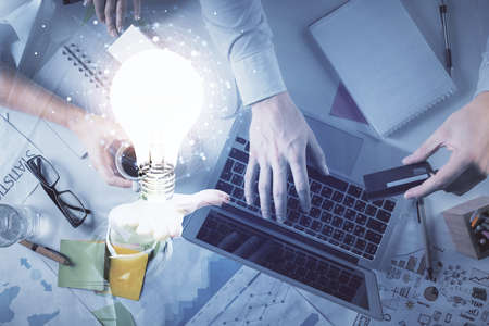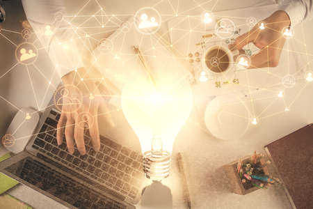 Double exposure of man and woman working together and bulb drawing. Computer background. Top View. Idea concept.