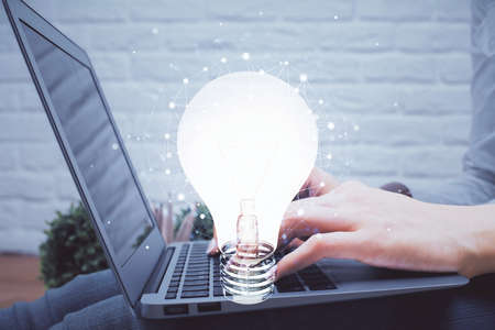 Double exposure of woman hands typing on computer and light bulb drawing. Idea concept.