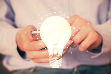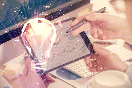 Double exposure of man's hands holding and using a digital device and bulb hologram drawing. Idea concept.