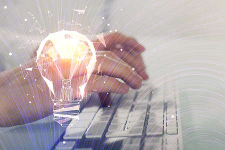 Double exposure of woman hands typing on computer and light bulb drawing. Idea concept.