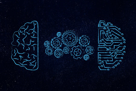 artificial intelligence and deep learning, from human brain to microchip brain with gearwheel mechanism in between