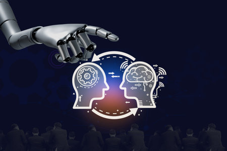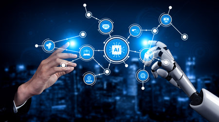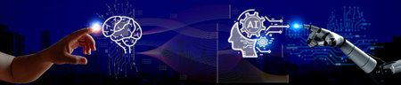 Hands of artificial intelligence (AI) touching a brains, Symbolic, Machine learning, of futuristic technology. Big data, Science, AI network on business analysis, innovative and business growth development.